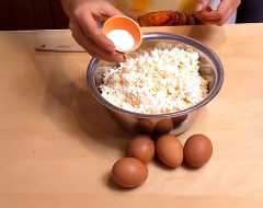 Творог выкладываем в миску, добавляем соль, разбиваем куриные яйца, но прежде куриные яйца нужно помыть, чтобы в блюдо не попали бактерии и грязь.