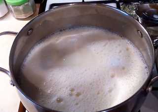 В отдельную кастрюлю выливаем всё молоко, ставим кастрюлю на сильный огонь и доводим молоко до кипения при периодическом перемешивании.