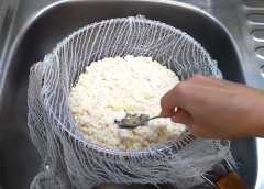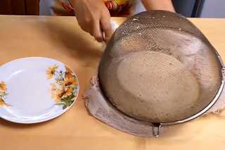Для этого сито выстилаем мокрой марлей и выливаем содержимое кастрюли, сыворотку можно использовать для приготовления блинов или окрошки.