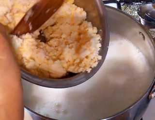 Как только молоко закипело, выкладываем в него творожно-яичную смесь порциями, при этом каждый раз массу перемешиваем.