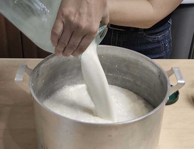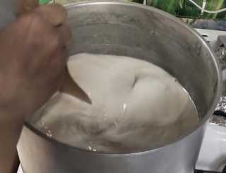 В алюминиевую кастрюлю выливаем молоко, ставим на плиту и доводим до кипения при периодическом перемешивании. Считается, что именно в алюминиевой кастрюле молоко почти не пригорает.