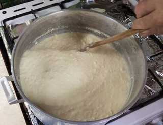 Молоко, у меня, закипело через 25 минут, напомню, что готовлю сыр я на средней конфорке и не убавляя огня добавляем творожно-яичную массу.