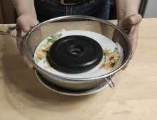 Сито с сыром перемещаем на тарелочку, края марли складываем поверх массы, аккуратно её расправляем, ставим тарелочку, на которую помещаем груз (1 кг 250 гр.).