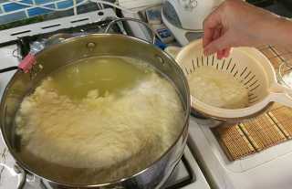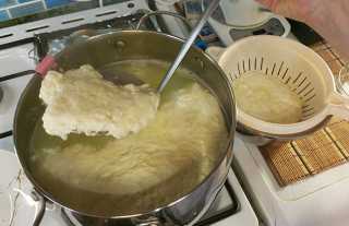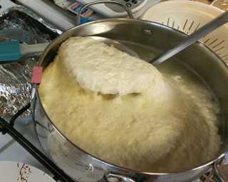 Наливаем, равномерно, по стенкам весь горячий раствор, уменьшаем огонь до самого малого и доводим температуру сыворотки до 94 градусов, следим за тем, чтобы сыворотка не закипела, сгусток ни в коем случае не перемешиваем.
