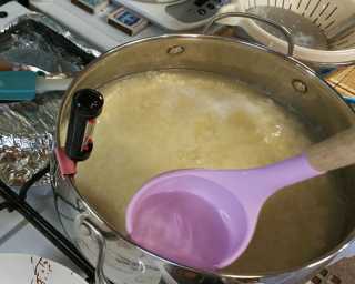 Молоко нагрелось до 79 градусов, последний раз его перемешаем и даём подняться до температуры в 82 градуса.