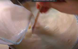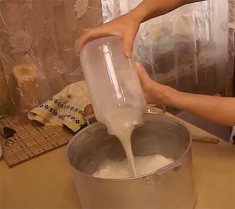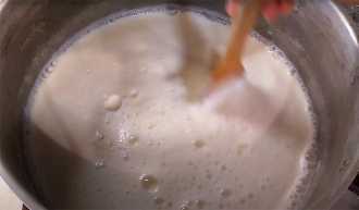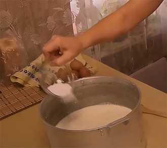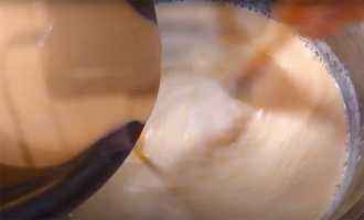 4. Молоко закипело, тонкой струйкой заливаем в него сметано-яичную смесь, при быстром перемешивании.
