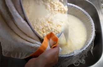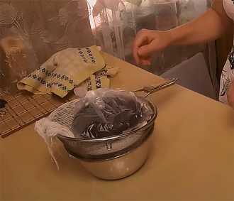 7. Сито застилаем марлей, которую предварительно нужно намочить холодной водой и отжать, и выливаем массу. Края марли аккуратно связываем между собой и подвешиваем за ручки шкафчика. Оставляем массу, в подвешенном состоянии, на 30 минут – пусть стечёт сыворотка.