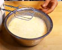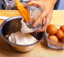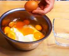 3. Пока молоко закипает займёмся заправкой. В миску выкладываем сметану, разбиваем куриные яйца, но прежде яйца нужно помыть мыльной, теплой водой и взбиваем массу венчиком или при помощи миксера до легких пузырьков.