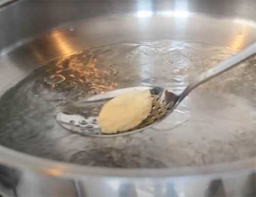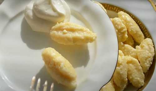 Чайную ложечку обмакиваем в растительное масло, набираем тесто, формируя продолговатую колбаску, выкладываем на ложку с дырочками и опускаем её в средне кипящую воду. Первый вареник нужно подержать в ложке, в кипятке, на предмет стойкости, т.е. нам нужно проверить держит ли он форму. Если вареник распадается, то следует добавить ещё 1 ч. ложку муки, в тесто.