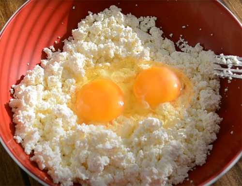 Творог выкладываем в миску, разминаем его вилкой до мелкой фракции. Можно пропустить его через мясорубку.