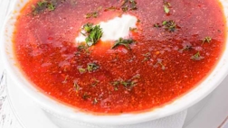 Свекольник готов, разливаем его по тарелочкам, добавляем по 1 ст. ложке сметаны и зовём всех к столу.