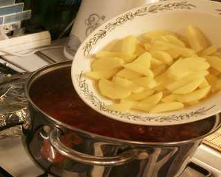 Его мы промываем водой, снимаем кожуру, нарезаем на брусочки и оправляем в кастрюлю с готовой свеклой, если нужно, то добавляем воду до ручек кастрюли, доводим до кипения, добавляем 1 ч. ложку соли, уменьшаем огонь до среднего и варим 10 минут до готовности картофеля.