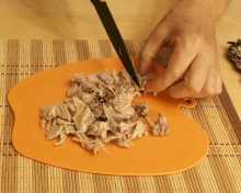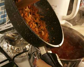 Мясо освобождаем от кости, разбираем на волокна, добавляем в сковороду к пережарке, перемешиваем и жарим при малом огне 5 минут.