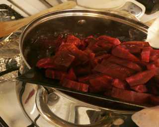 Бульон ставим на плиту и доводим его до кипения. Нарезанную свеклу осторожно перекладываем в бульон, доводим до кипения, уменьшаем огонь до среднего и варим 30-40 минут до готовности.