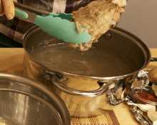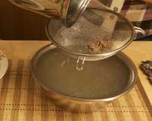 Бульон я сварила из косточки с мясом, в течение 2 часов (при малом кипении), остудила до теплого состояния, вынимаем кость из кастрюли, а бульон процеживаем через сито. Процеживаю бульон для того, чтобы отцедить косточки и пену. Всего получилось 1 литр 500 мл бульона.