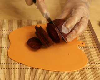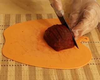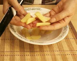 Свеклу промываем водой, снимаем кожицу, нарезаем брусочками, примерно, 0,5 см толщиной и 2-3 см длиной.