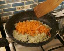 Морковь, промываем водой, снимаем кожуру, натираем на крупной тёрке и отправляем в сковороду к луку, обжариваем 5 минут, при среднем огне, постоянно перемешивая, уменьшаем огонь до малого и будем всё обжаривать до золотистого цвета.