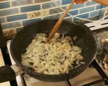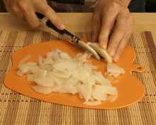 Репчатый лук очищаем от шелухи, промываем водой, нарезаем мелкими кубиками и отправляем в сковороду – обжариваем 2 минут, при постоянном перемешивании, на сильном огне.