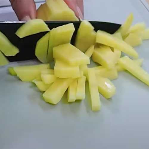Картофель, промываем водой, снимаем кожуру, нарезаем средней соломкой.