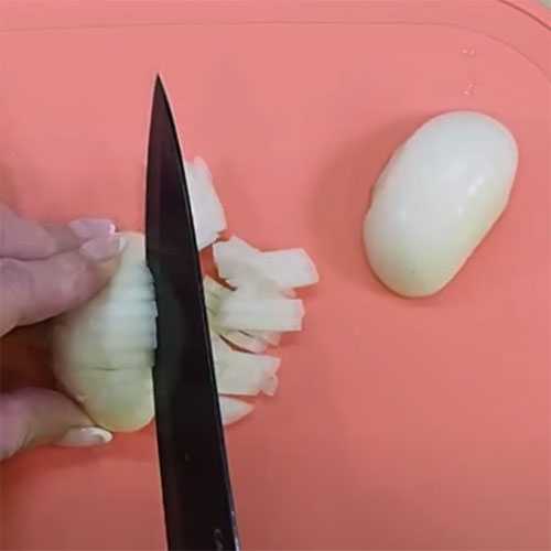 Начинаем приготовления супа с репчатого лука. Его освобождаем от шелухи, промываем водой и нарезаем мелкими кубиками.
