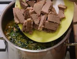 Картофель сварился, добавляем в кастрюлю: крапиву, щавель, мясо, которое предварительно нарезали брусочками, лавровый лист и специи для супа.