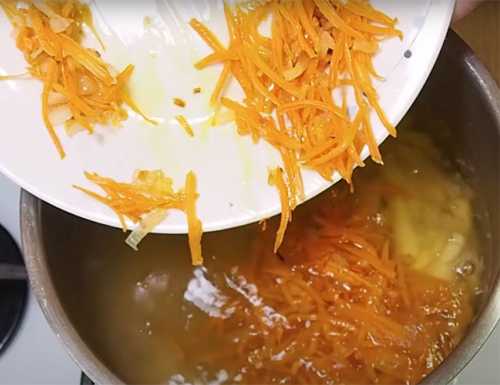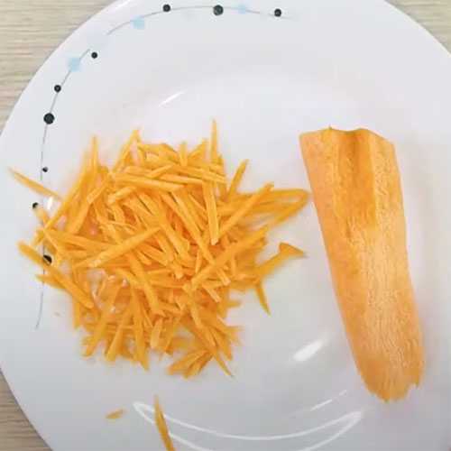 Пока лук обжаривается займемся морковью. Её промываем водой, снимаем кожицу, натираем на крупной тёрке и отправляем к луку, пусть всё жариться 10 минут, при этом огонь нужно убавить до среднего.