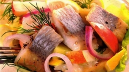 7. Сельдь освобождаем от внутренностей, удаляем голову и хвост и распускаем на филе. Подготовленное филе нарезаем средними кубиками, смешиваем с луком и небольшим количеством желатинового майонеза и равномерно выкладываем поверх картофеля – это будет второй слой.
