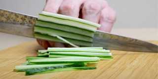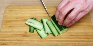 Свежие огурцы, промываем водой, вынимаем сердцевину, нарезаем тонкой соломкой, которую нарезаем по 2 см в длину и выкладываем на сыр.
