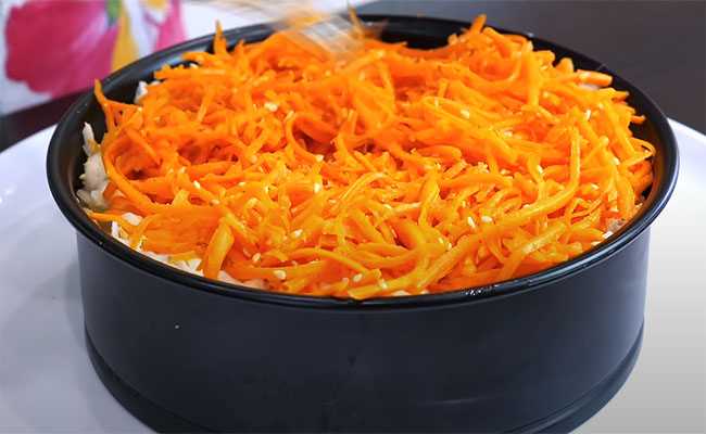 Морковь по-корейски отжимаем от сока, нарезаем длиной по 3 см и выкладываем поверх пятого слоя.