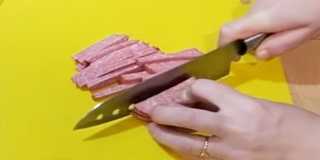 Ветчину нарезаем соломкой, делим на две части и одну часть выкладываем на сыр – это второй слой.