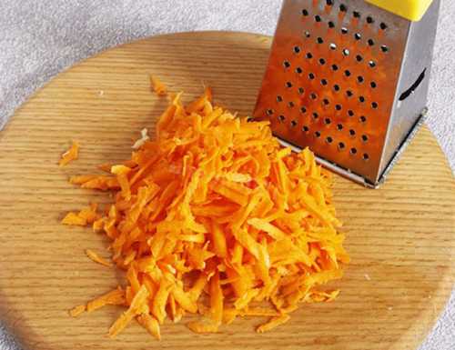 Морковь, промываем водой, снимаем кожуру и натираем на средней тёрке.