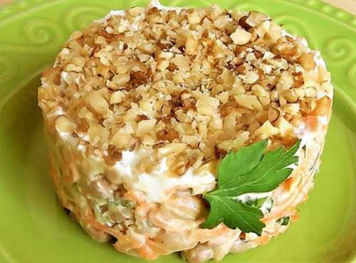 В сервировочное кольцо выкладываем салат, присыпаем его грецкими орехами и подаём к столу.