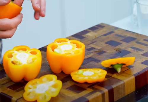 Болгарский перец, промываем водой, очищаем от плодоножки и мякоти с семенами.
