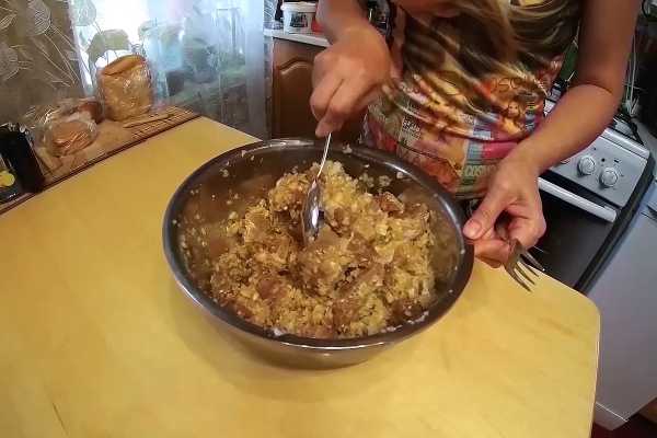 Мясо подготовили, теперь в него высыпаем лук и тщательно перемешиваем.