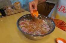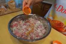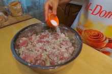 Добавляем соль, приправу для мяса и горький перец, приправу будем добавлять в два приёма, массу перемешиваем.