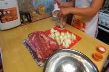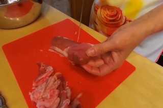 Мясо, прежде чем резать на кусочки нужно освободить от пленки, жил и лишнего жира.