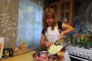 Лук мы будем резать на средние фрагменты и пропустим его через мясорубку или блендер.