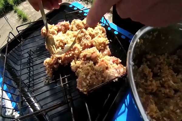 Мясо накладываем на решетку вместе с луком и жарим до готовности. Данный шашлык настолько сочный, что его можно кушать и без кетчупа.