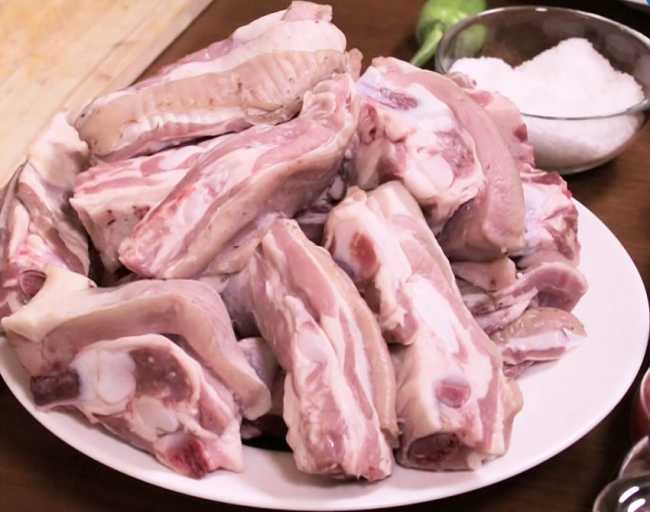 Для приготовления этого блюда можно взять рёбра свинины или говядины, нарезаем их на порции и присаливаем.