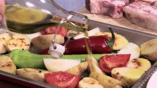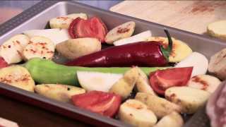 Добавляем лук, помидоры и болгарский перец (целиком) к картофелю, равномерно распределяем их на противне, ингредиенты слегка присаливаем и добавляем растительное масло.