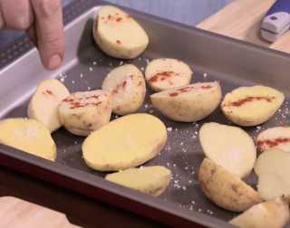 Укладываем ребра на противень, поверх картофеля, помидор и лука, присаливаем и посыпаем красной паприкой.