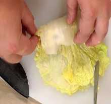Вынимаем капусту из микроволновки и разбираем на листья, если не все листья отсоединились, то опять делаем надрезы и отправляем капусту в микроволновку на 5 минут.