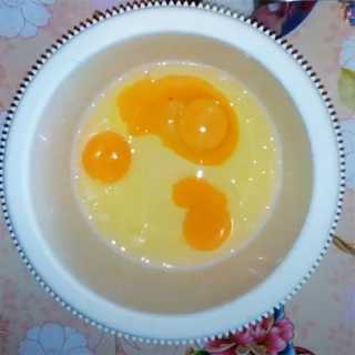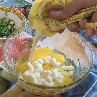 В миску разбиваем яйца, добавляем майонез и слегка взбиваем. Добавляем половину нормы натертого сыра и перемешиваем.