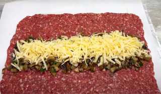 На фольгу стелим пергаментную бумагу, распределяем фарш, толщиной в 0,5 см, по середине выкладываем начинку из грибов, поверх посыпаем натёртым сыром и сворачиваем в рулет.