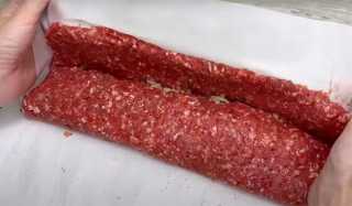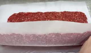 Приподнимаем один край фарша, накрываем полностью начинку и слегка придавливаем, отгибаем пергамент. Тоже делаем с другим краем, который внахлёст покрываем фарш с начинкой - прижимаем. Пергамент оставляем на рулете и другим краем пергамента покрываем рулет.