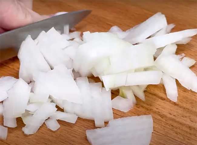 Репчатый лук, очищаем от шелухи, промываем водой и шинкуем на мелкие кусочки.