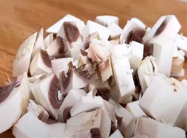 Свежие шампиньоны, промываем водой, шинкуем средними кубиками.