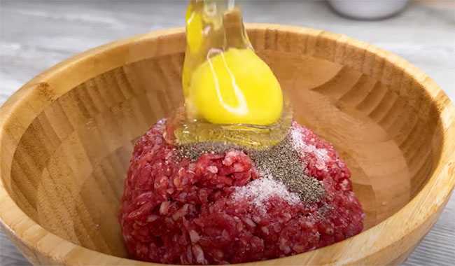 В миску выкладываем фарш, добавляем яйцо, солим, перчим – хорошо вымешиваем.