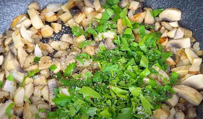 Петрушку промываем водой, шинкуем на средние фракции, добавляем в сковороду с грибами, солим, перчим и жарим 2 минуты. Отставляем в сторону – пусть остынет.