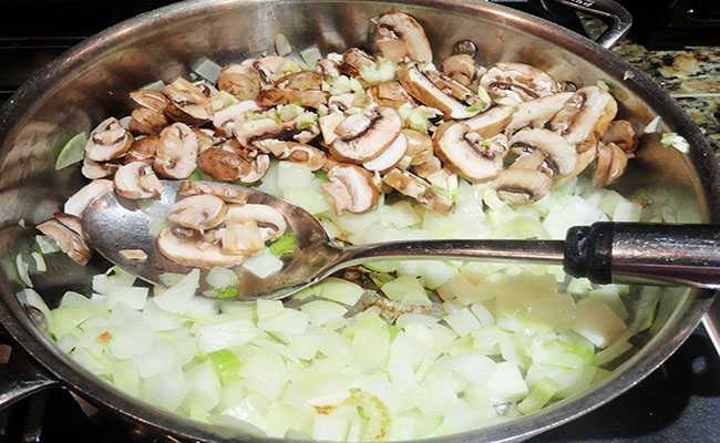 3. В сковородку добавляем 3 ст. ложки растительного масла, подогревают его, засыпаем лук, грибы, солим, перчим, уменьшаем огонь и жарим массу до готовности.